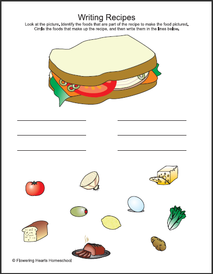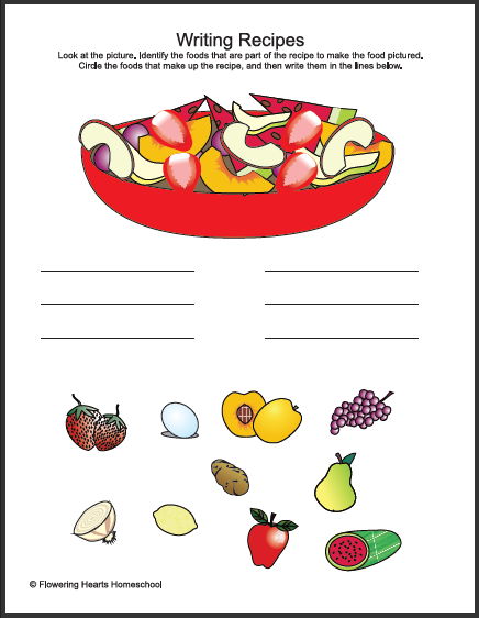 Students of any language can study the colorful meal and find which foods pictured are found in the recipe. Challenged to recognize foods that are cut up or altered in some way, students make connections to the foods, then write the names of the foods on the lines below each full-color original illustration of a meal. 6 pages, full-color original illustrations